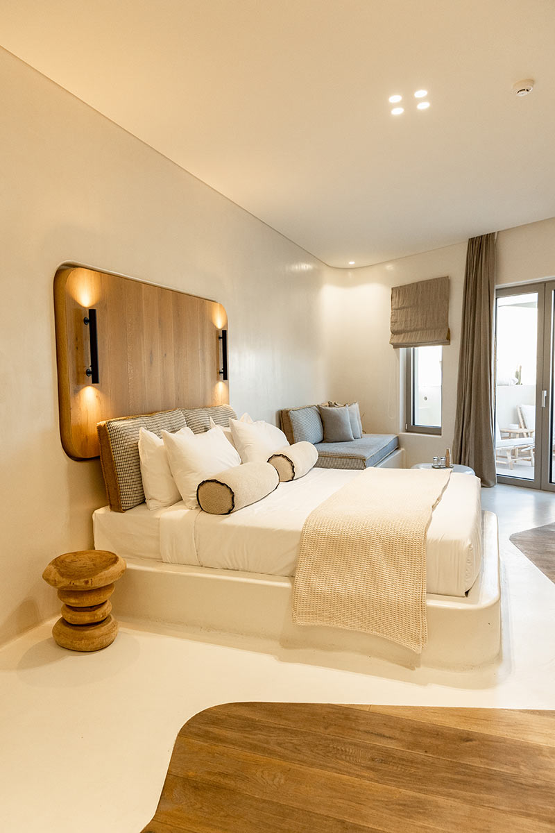 Located on the ground floor, these four open-plan suites each have a terrace with partial sea views. The built-in bed, sofa, desk, and bathroom vanity all flow naturally from the wood and polished concrete floors.