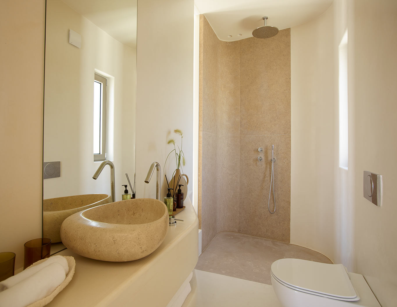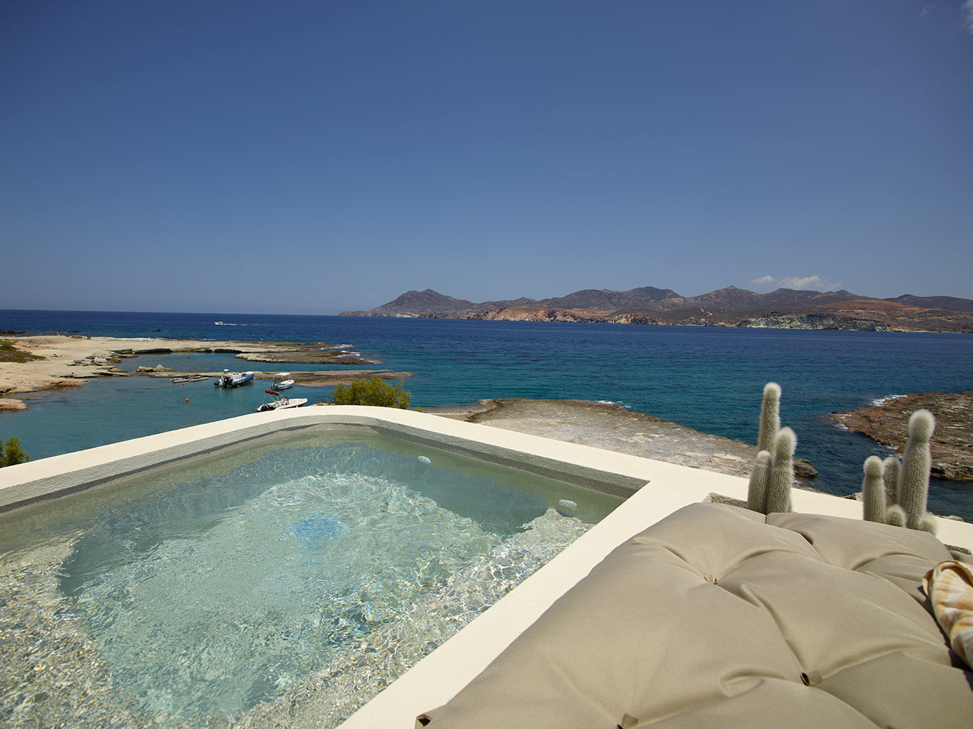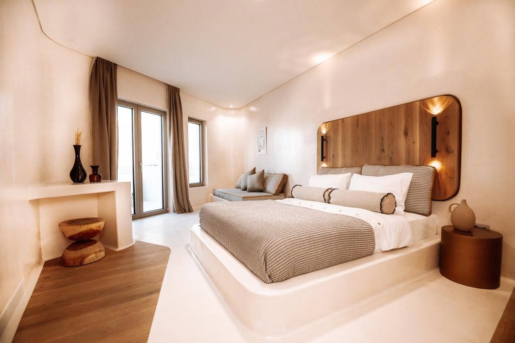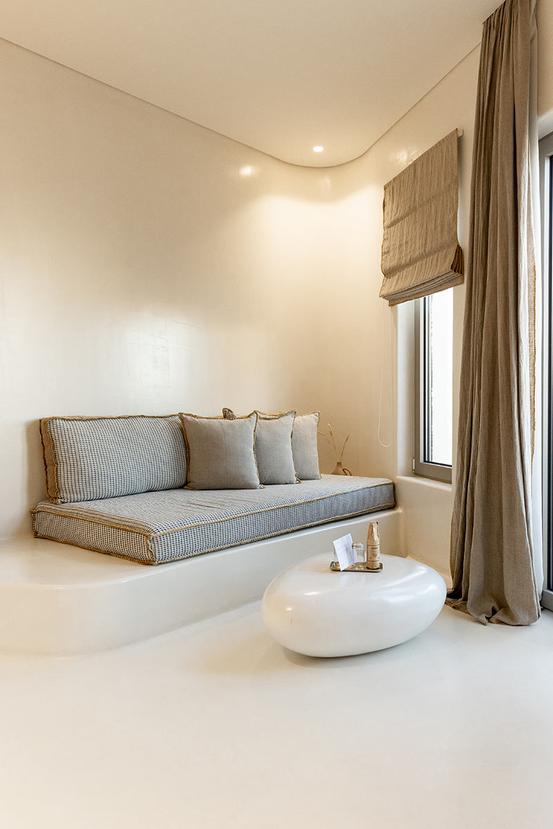 Situated on the upper level, these four extra-special suites enjoy the most privileged views and utmost privacy. Designed with couples in mind, our honeymoon suites have spectacular vistas, overlooking whitewashed Pollonia and the golden cliffs of Kimolos across the straits. A plunge pool with water jets is tucked away on your sun-dappled terrace for soaking up the scenery in blissful seclusion.